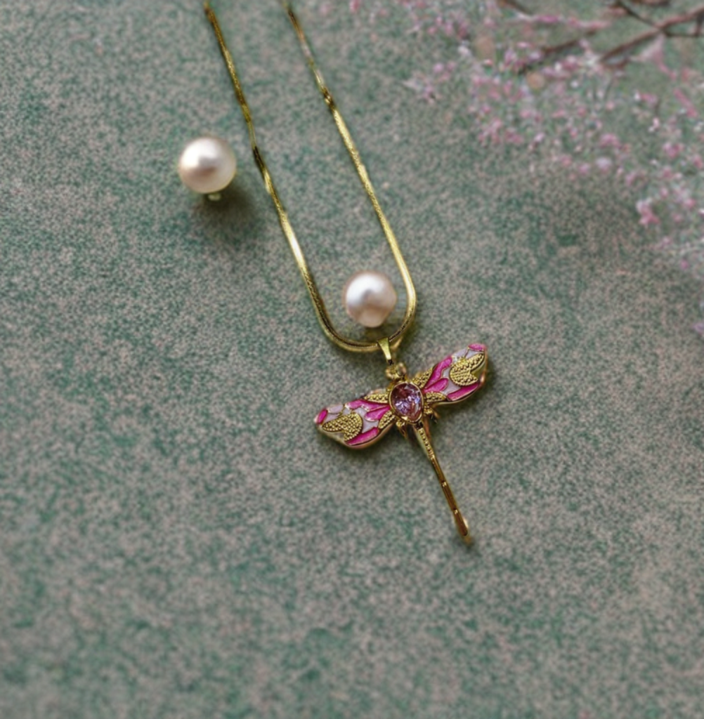 The Aurora Dragonfly Pendant captures the delicate beauty of nature with its gold-toned frame and vivid pink enamel wings. Adorned with a shimmering central stone, this piece symbolizes transformation and grace — a perfect blend of elegance and whimsy for any occasion. (KNK238082)