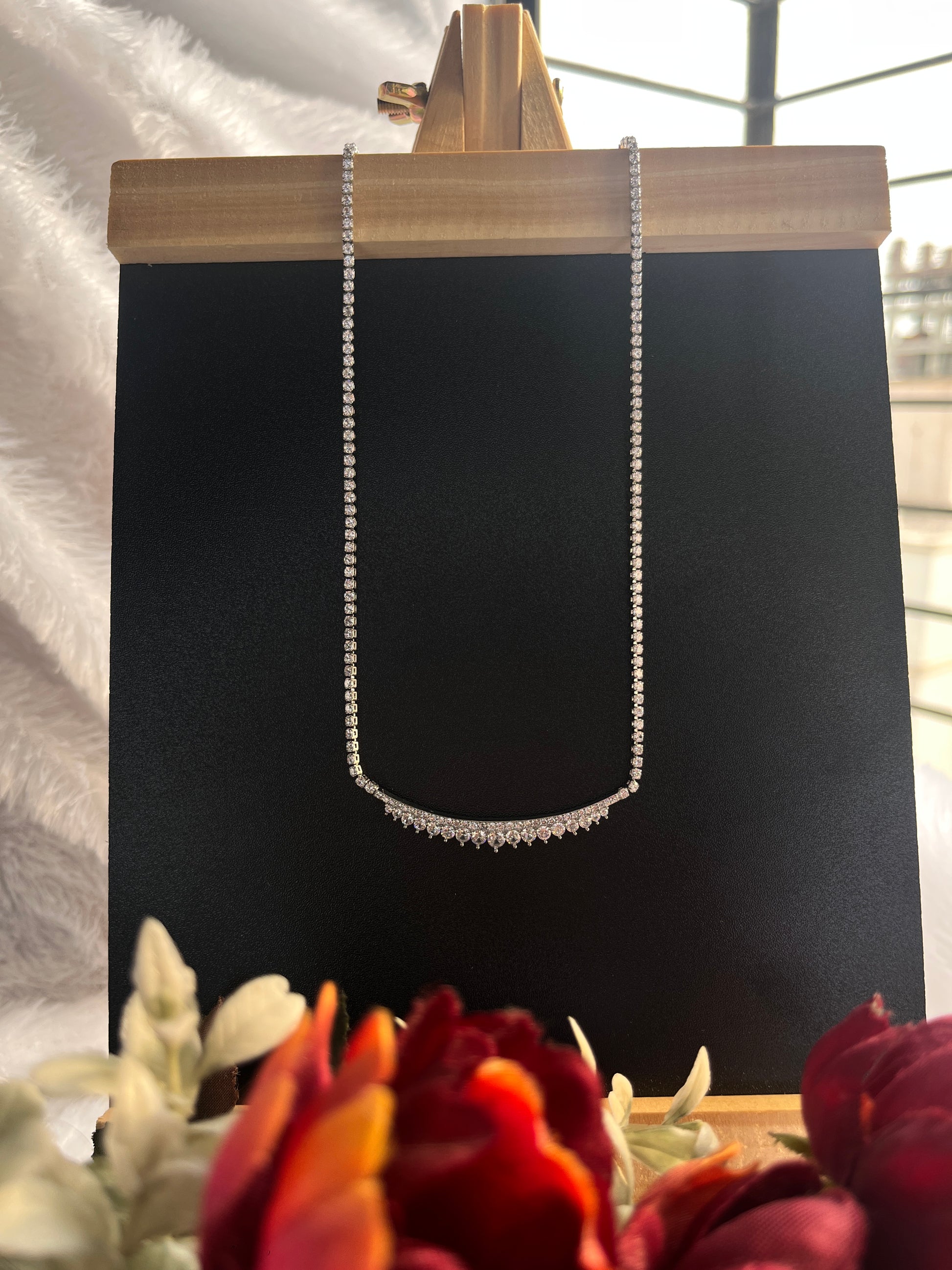 A delicate diamond necklace featuring a graceful curve of shimmering stones, perfect for adding timeless elegance to any look. Ideal for special occasions or refined everyday wear. (KNK290055)