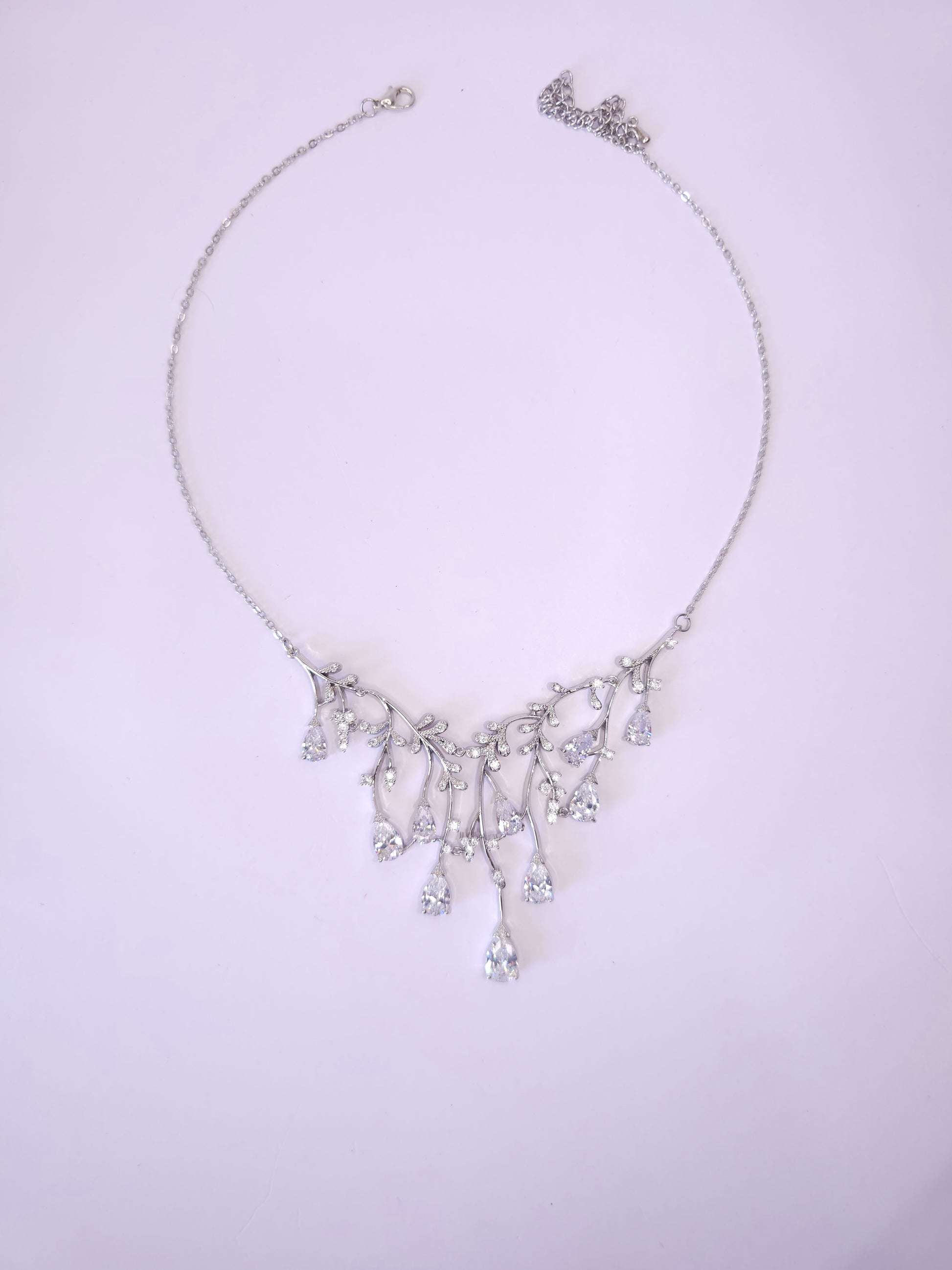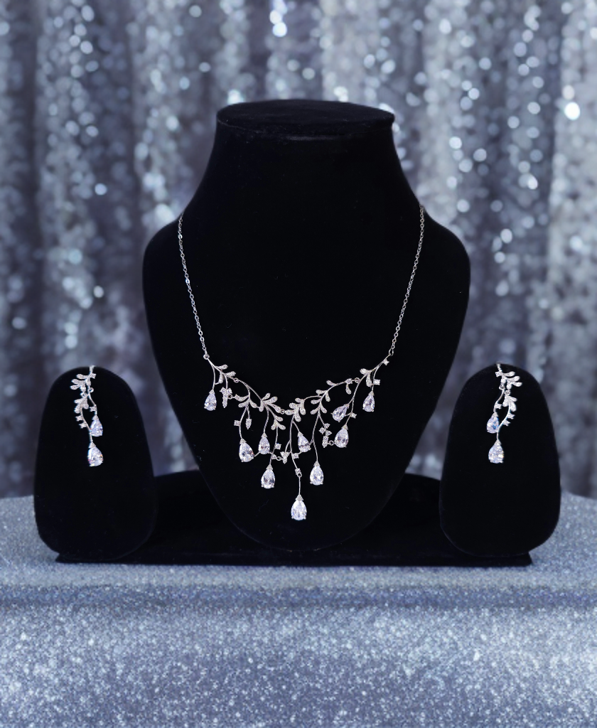 Graceful and refined, the Crystal Dewdrop Necklace Set features a cascading vine-inspired design adorned with shimmering teardrop stones. Crafted in a sleek silver finish, this set captures the elegance of glistening morning dew, making it the perfect accessory for evening galas, weddings, or cocktail parties. Includes matching earrings for a complete, ethereal look.