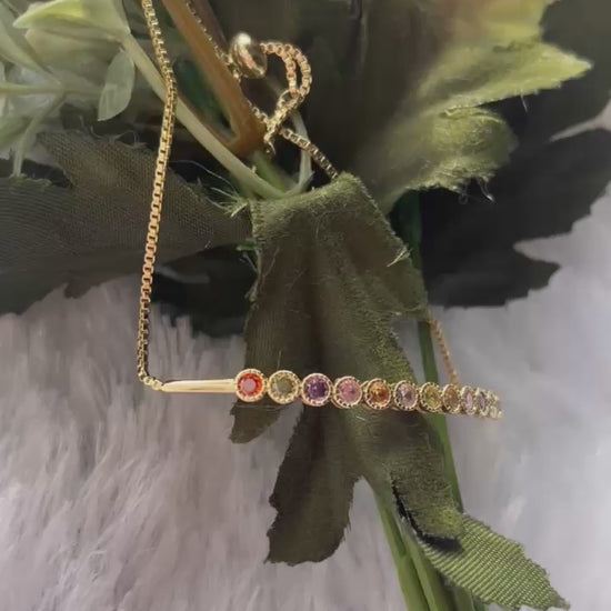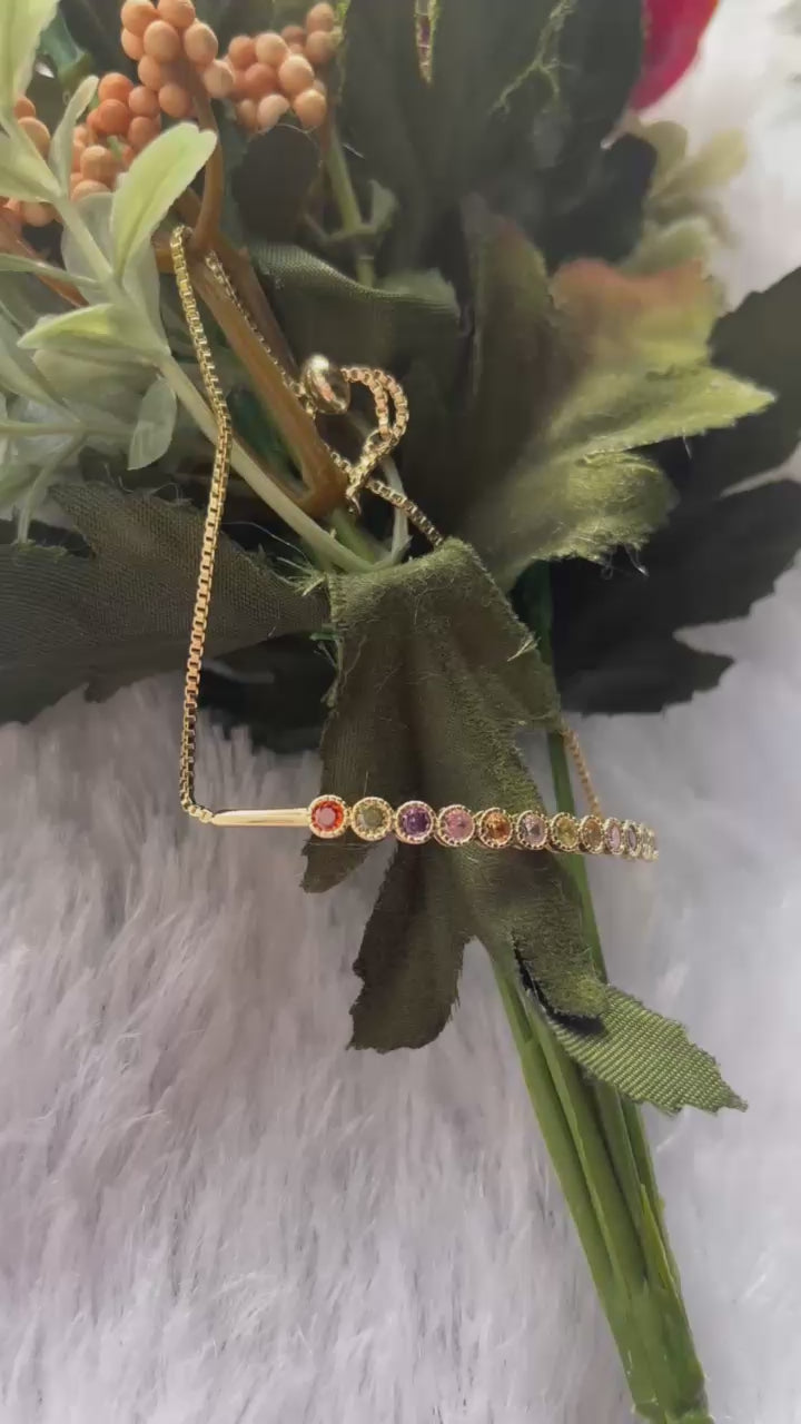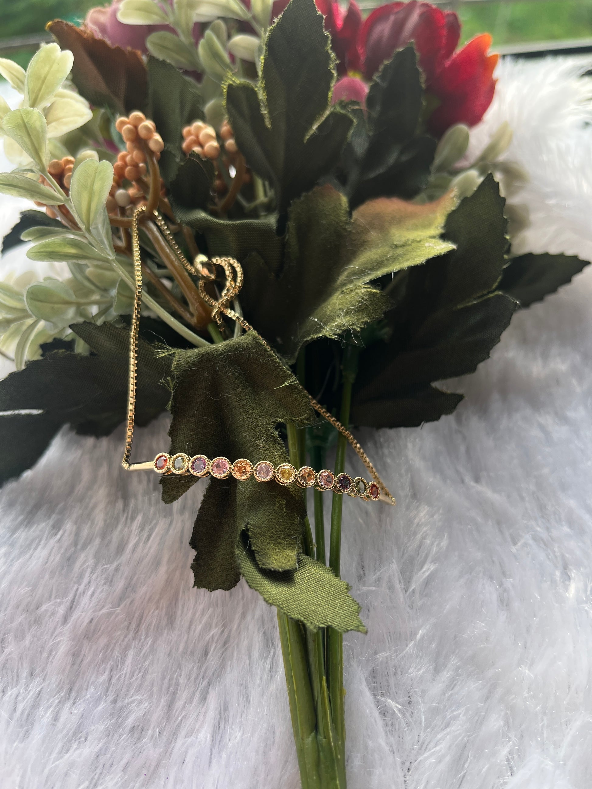 A vibrant bracelet featuring a row of multicolored stones, perfect for adding a playful touch of elegance to any outfit. (KNK210036A)