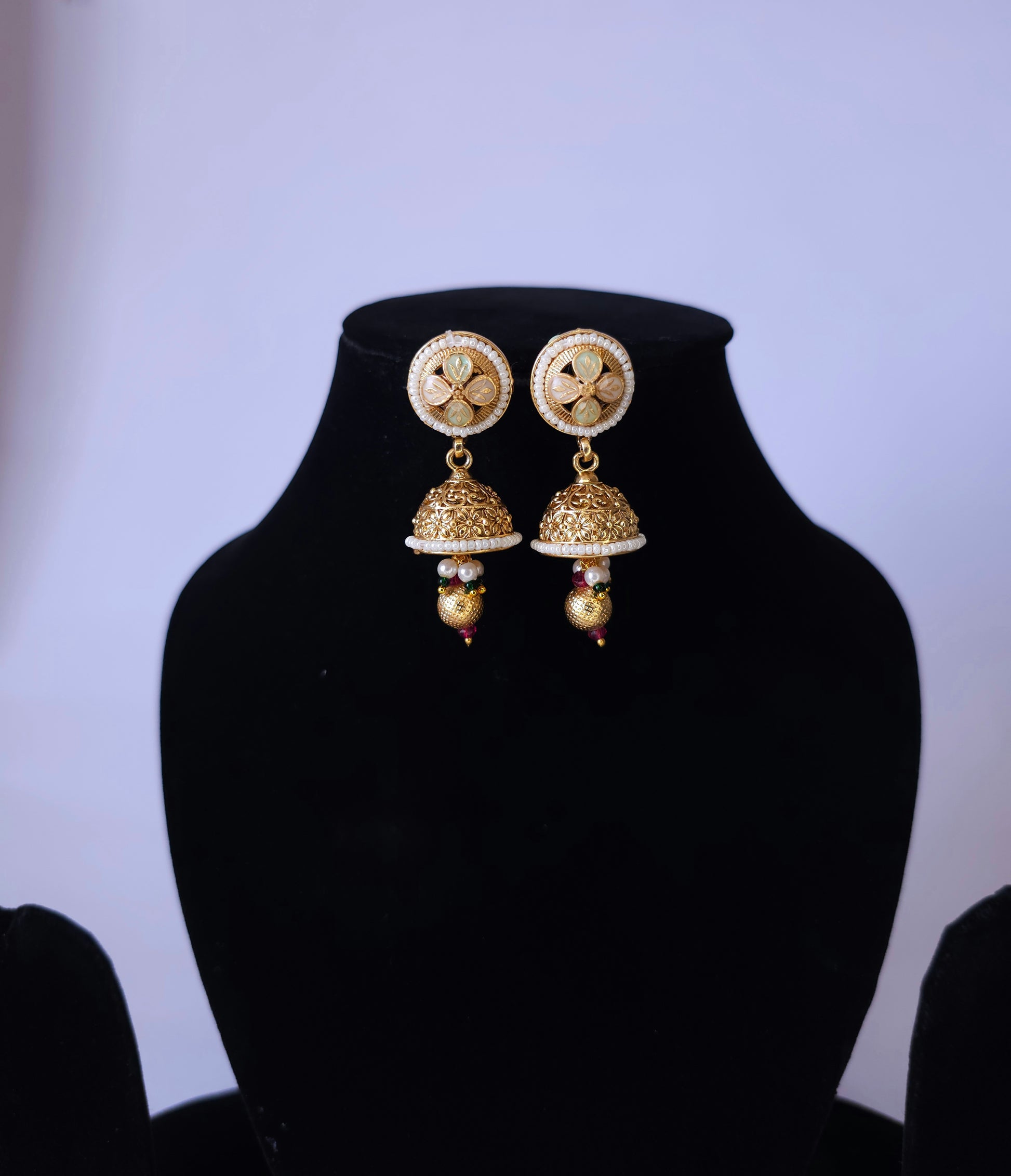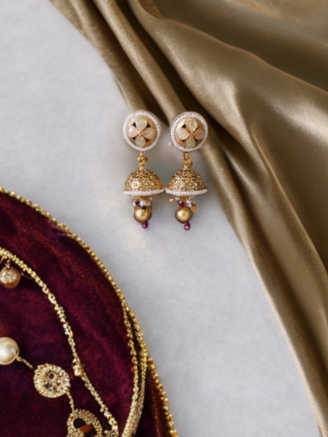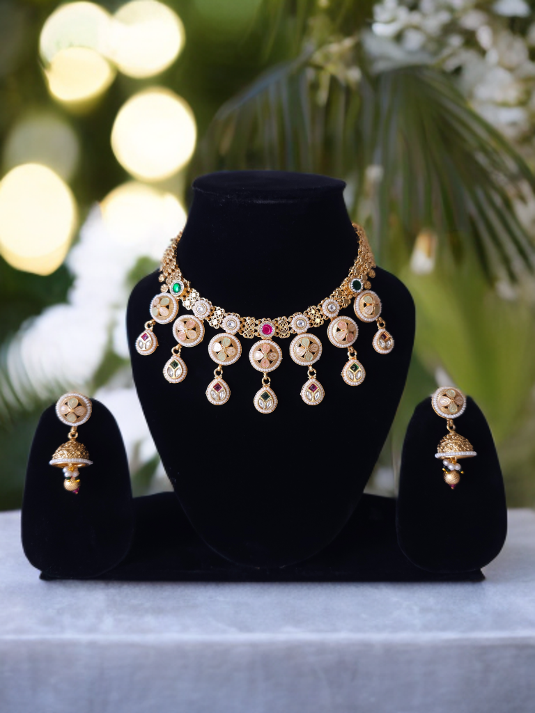This unique necklace set features a string of ornate circular medallions and tear-drop charms, adorned with traditional enamel detailing and sparkling stones. Accentuated with regal jhumka earrings, it offers a bold and majestic statement—perfect for brides or grand festive occasions.