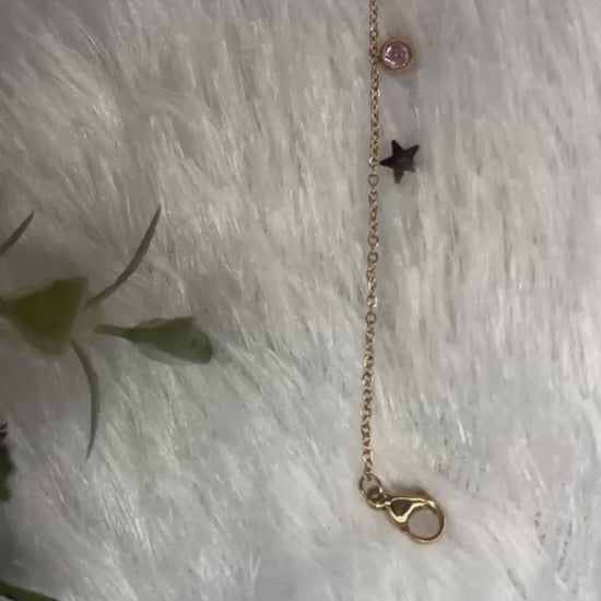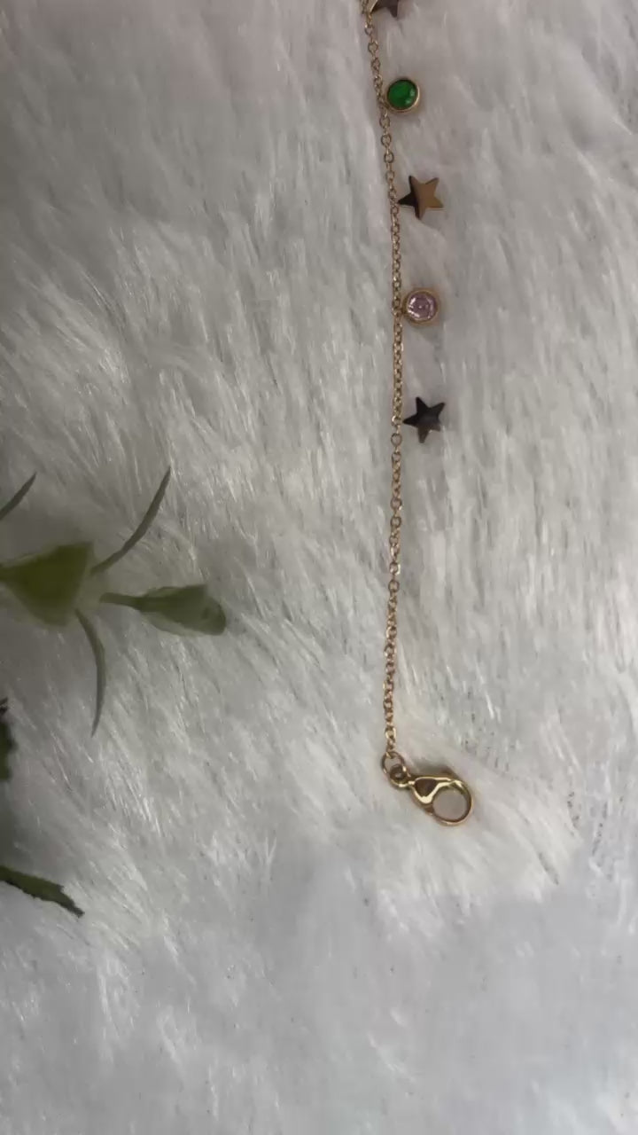 This image showcases a delicate bracelet with a gold chain featuring star-shaped charms and small colored gemstones. The bracelet has a simple yet elegant design, with a combination of stars and small colored stones (green and red) that add a playful, cosmic touch. The bracelet is paired with a few rings on the hand, adding to the overall aesthetic. The background includes rich-colored flowers, which further enhance the warm and chic vibe of the jewelry. (KNK120031B)